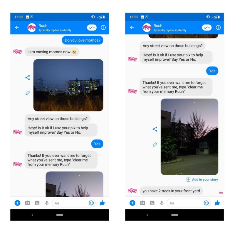What I particularly like about Ruuh is how she uses just the right bit of Hinglish and doesn’t make the chat monotonous or “robotic”. You can hardly sense if you are talking to a bot or a friend! Her use of common Hinglish phrases like “kaisa hai?”, “tum btao”, “bore ho raha hai yaar”, etc. give you a visualization of actually interacting with a human. She can talk on almost any topic, be it her travel journey of Dubai or her cravings for momos!