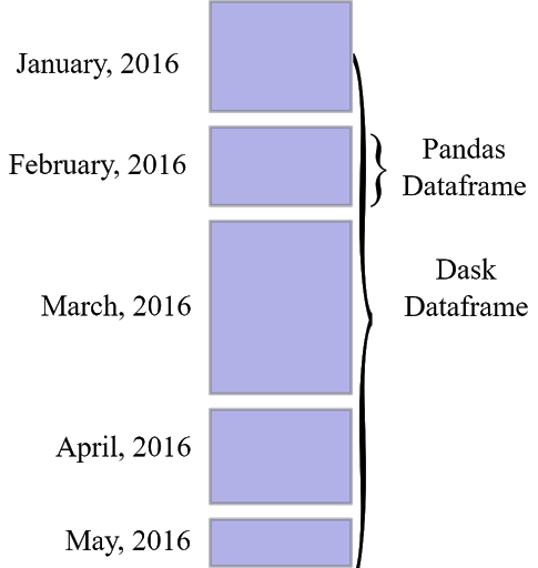 Dask DataFrames coordinate many Pandas DataFrames/Series arranged along the index. A Dask DataFrame is partitioned row-wise, grouping rows by index value for efficiency. These Pandas objects may live on disk or on other machines.