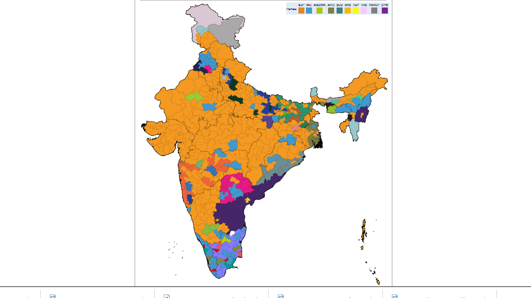 This is a live status update of the election vote counts by Maps of India. The map shows the distribution of different parties across the country. The Bharatiya Janata Party dominated most if the states. You can find the live update here.